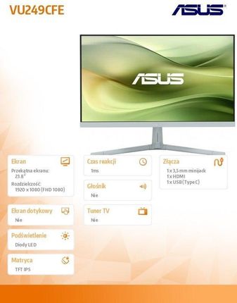 vu249cfe-g Побачте світ по -різному, що нові дисплеї Asus VU - це ідеальний вибір для тих, хто шукає чудовий монітор для щоденного використання. Вони пропонують усі функції та підключення, необхідні для різних завдань, від ігор та розваг до продуктивності та творчості. Їх стильні кольорові параметри та вбудована система управління кабелем допоможуть вам створити чисту та впорядковану конфігурацію комп'ютера. Вони не тільки недорогі, але й мають збалансований сертифікат технологій, тому вони чудово підходять для вас і приємніше для нашої планети.