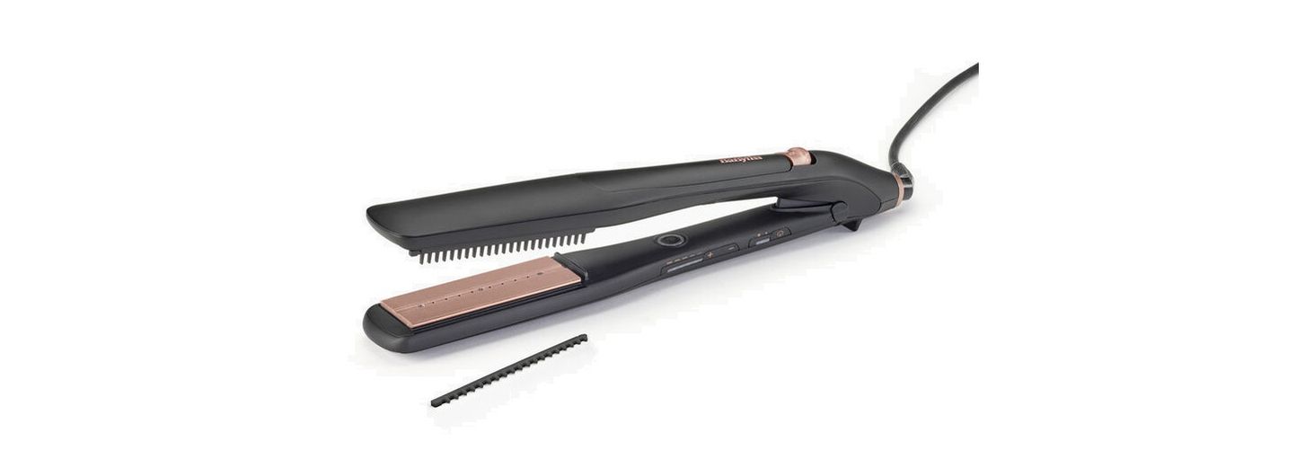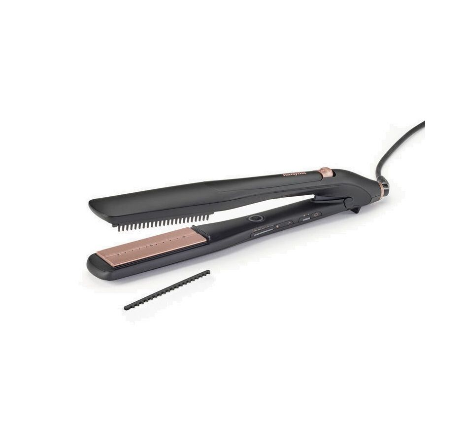 сушарка для Styler Style Babyliss з вдосконаленою технологією пари на 360 °. 36 мм згладжування титано-керамічної плаваючої плитки в поєднанні з зволожуючим ефектом пари забезпечують блискучу і гладку обробку зачіски. Завдяки вдосконаленій системі опалення Ceramics ™ навіть тепло для кожної секції волосся надається під час випрямлення. Включає дві знімні кріплення для розчісування та згладжування волосся