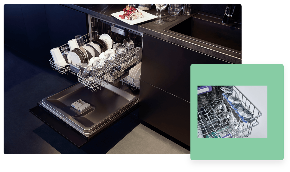 Ви коли -небудь розбивали окуляри під час миття в посудомийній машині? Полиці SoftTouch ™ у верхньому кошику обережно підтримують окуляри, що робить їх безпечними при миттях. Крім того, полиці регулюються, завдяки якому ви можете легко відповідати висоті зі своїми окулярами.