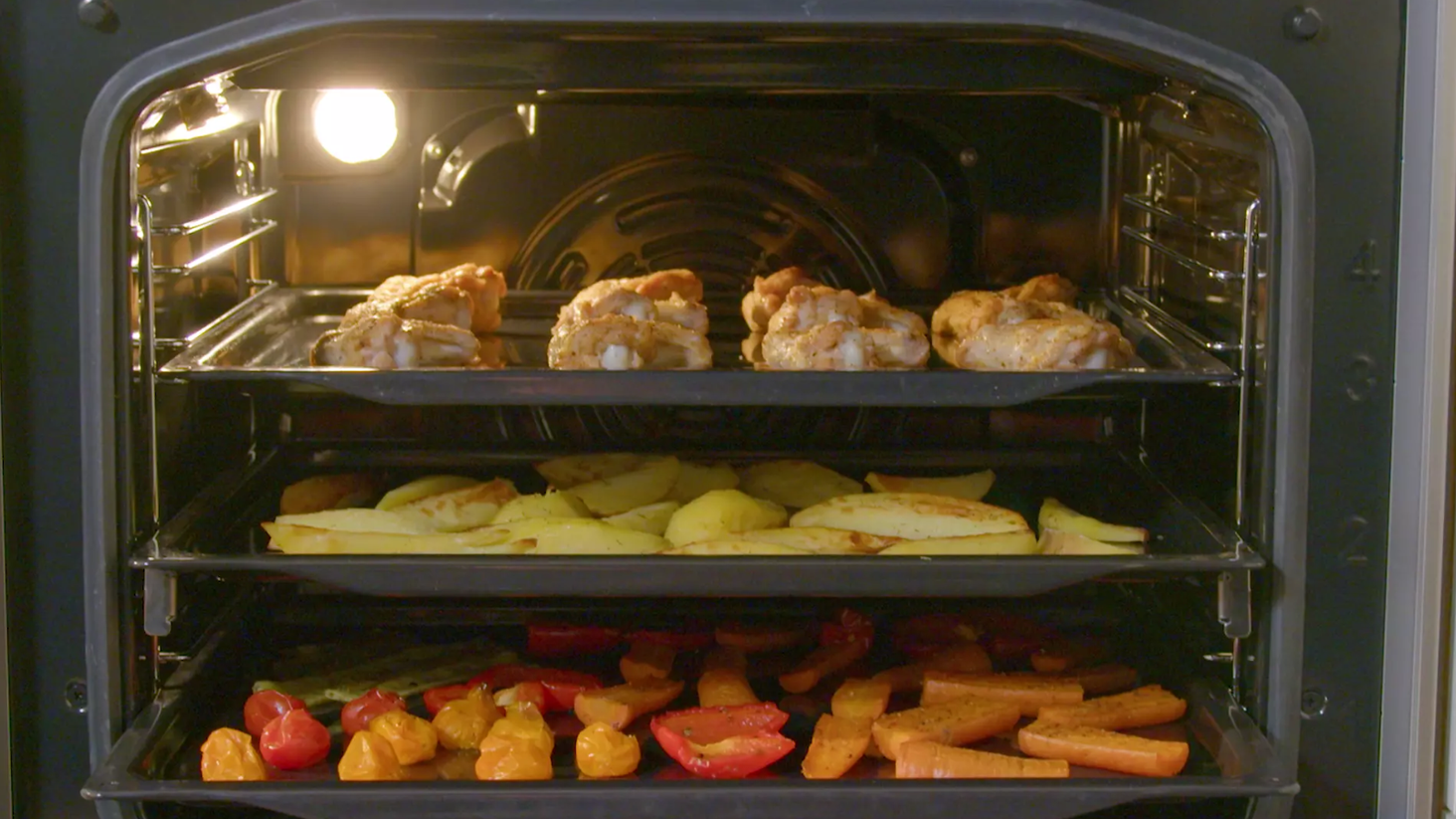 Поєднання інтелектуального руху повітря, рівномірно розподіленого простору між положеннями TAC та спеціальною злегка закругленою порожниною робить посуд рівномірно запеченим на кожному рівні, і тому, що об'єм духовки вищий, попередній перегляд також ідеальний.