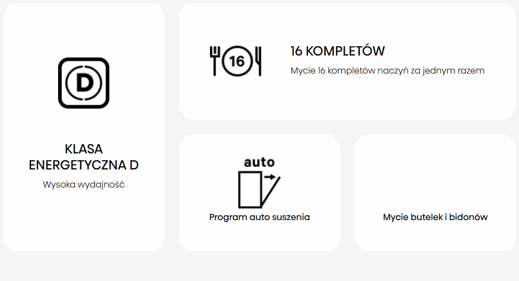 Одночасне миття до 16 наборів судин відразу. Завдяки трьом регульованим кошикам ви отримуєте достатньо місця, щоб мити 16 наборів суден для одного. Завдяки ергономічному інтер’єру посудомийної машини, який можна переставити по -різному, ви можете підходити до будь -якого предмета, заощадивши час та зусилля.
