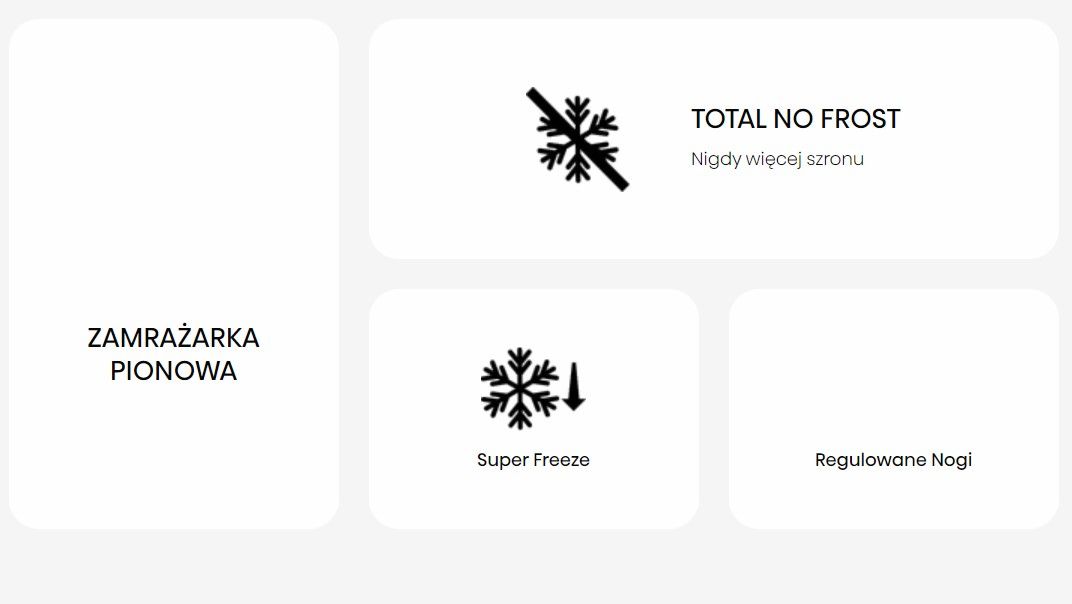 | Функції | No Frost, Szybkie zamrażanie, Blokada drzwi, Regulowane nóżki |