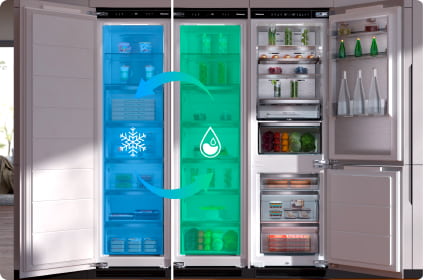 Фон морозильної камери покритий спеціальним металевим сплавом, який дозволяє навіть розподіляти прохолодне повітря по всьому холодильнику. Як результат, прохолодне повітря досягає кожного кута, підтримуючи ідеальний рівень температури та створюючи оптимальні умови для зберігання вашої продукції.