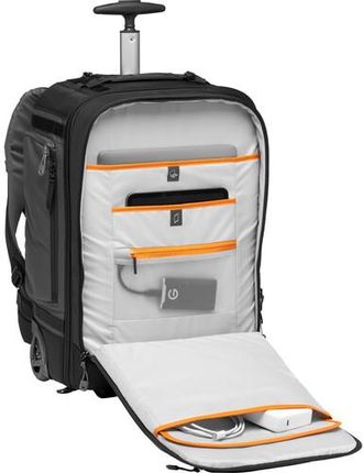 зручність Ногу валізи Lowepro Pro Trekker RLX 450 AW II можна швидко перетворити на рюкзак. Істрічні брекети та ремені стегна будуть корисними під час транспортування по спині, і, якщо потрібно, ви можете приховати їх, завдяки якому сумка буде працювати ідіані як ручний багаж, який відповідає стандартним вимогам авіакомпаній. Колеса Cyche, міцний підшипник та телескопічна ручка гарантують надійний та комфортний рух з валізою, навіть при високому навантаженні. Зовні ви також можете прикріпити фотопод.