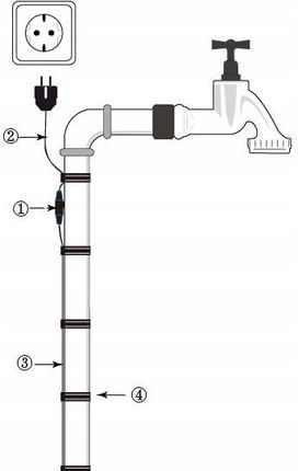 Площа навколо труби, яка повинна бути закріплена, повинна бути доступною та вільною від перешкод. Прикріпіть термостат з круглою чорною зоною контакту до найхолоднішої частини труби і зафіксуйте її ізоляційною стрічкою. Для належної установки для належної роботи термостат повинен дотримуватися поверхні труби. Потім покладіть весь кабель на трубу і прикріпіть його ізоляційною стрічкою з інтервалом від 30 до 60 см. Обов’язково ізолювати захищену секцію теплоізоляцією після встановлення кабелю.