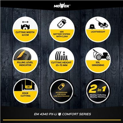 Technical Details: Виробник - Mowox Площа скошування - 350 Продюсер виробляє сім'ю - 40 В комфорт серії бездротової газонокосарки Назва продюсера - EM 4340 PX -li Вміст упаковки - акумулятор та зарядний пристрій Акумулятор: Ємність акумулятора - 2500