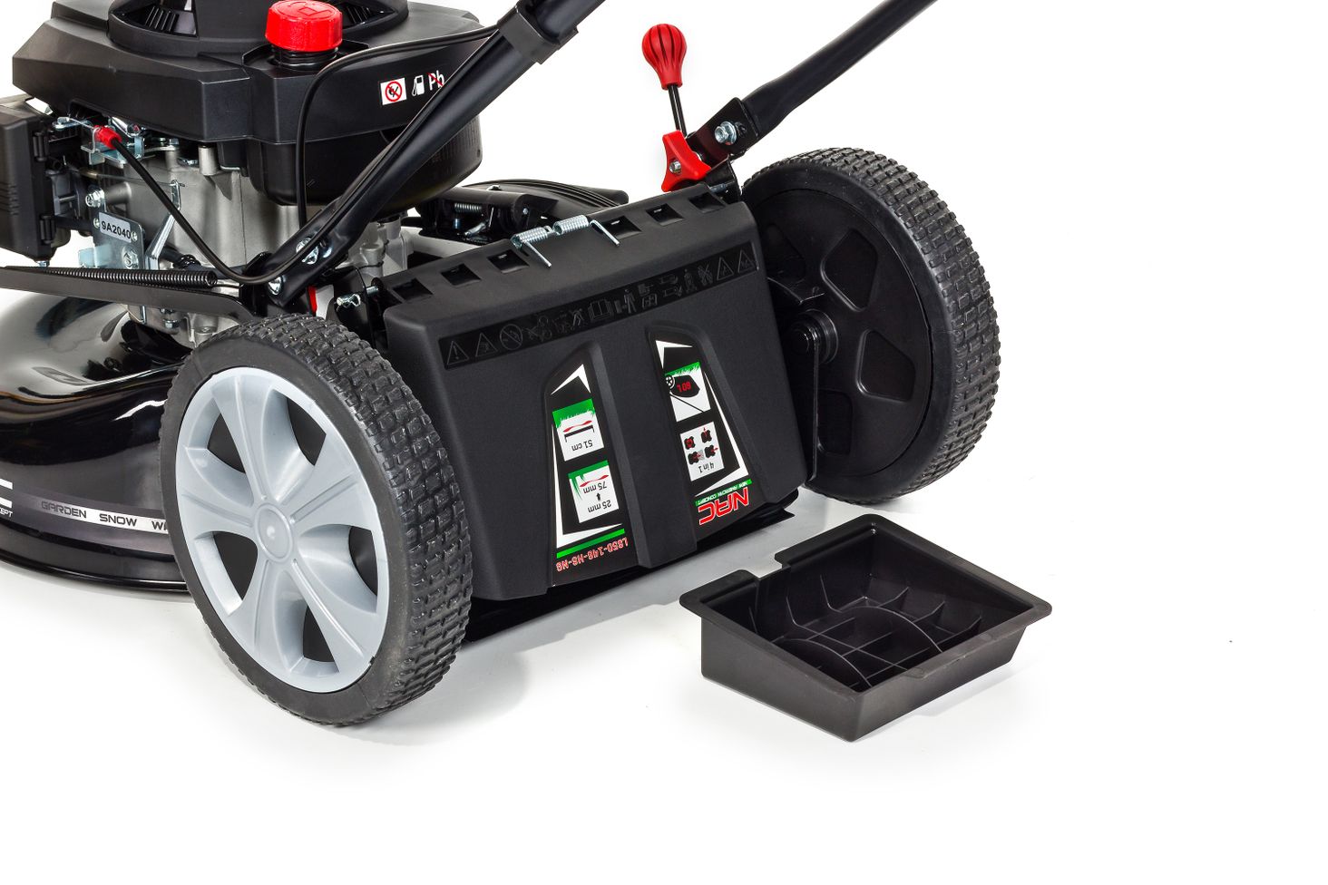 великі задні колеса з діаметром 25 см знижують опір кочення і полегшують косарку. Діаметр передніх коліс 18 см