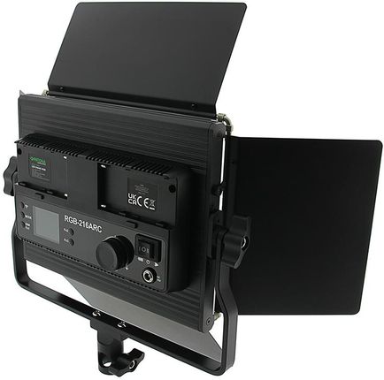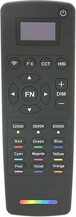 Синій дисплей РК -дисплея представляє встановлені значення яскравості, кольорової температури, решту ємності акумулятора та каналу, які використовує пульт дистанційного керування. Нашу студійну лампу можна керувати безпосередньо за допомогою панелі управління на задньому корпусі або опосередковано за допомогою пульта дистанційного керування. Дистанційне управління дозволяє керувати кількома студійними лампами, встановивши правильно. Максимальний діапазон - 50 метрів. Передача відбувається в діапазоні частот 2,4 ГГц.