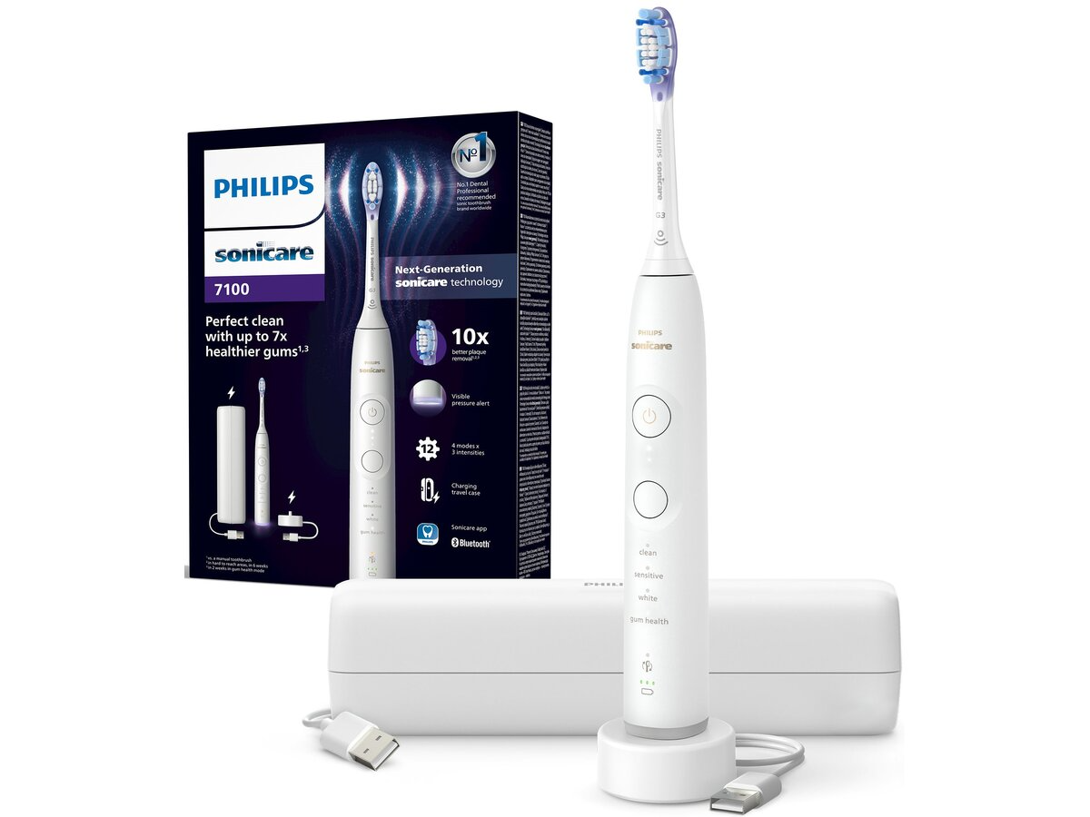 Ідеальне прибирання та до 7 разів здоровіші ясна*. Кисть Philips Sonicare 7100 оснащена технологіями Sonicare New Generation, 4 режимами чищення, 3 рівня інтенсивності, видимій сигналізації тиску та G3 Premium Gum Care G3 головки щітки.