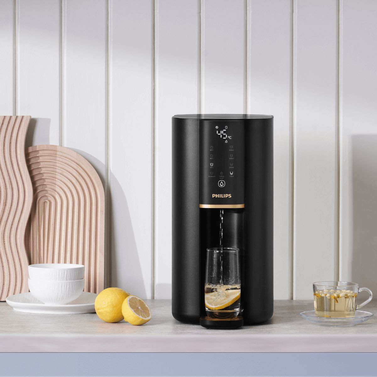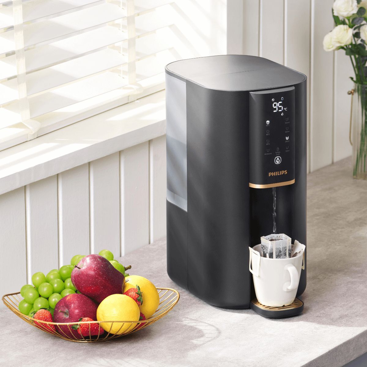 Легкий доступ до чистої питної води. Завдяки технології негайного опалення, цей розповсюджувач води з інвертованою системою осмосу забезпечує воду з різними температурами за кілька секунд. Інноваційна багатофункціональна фільтрація Aquashield з інвертованою системою осмосу видаляє 110 типів шкідливих речовин, які можна знайти у водопровідній воді*.