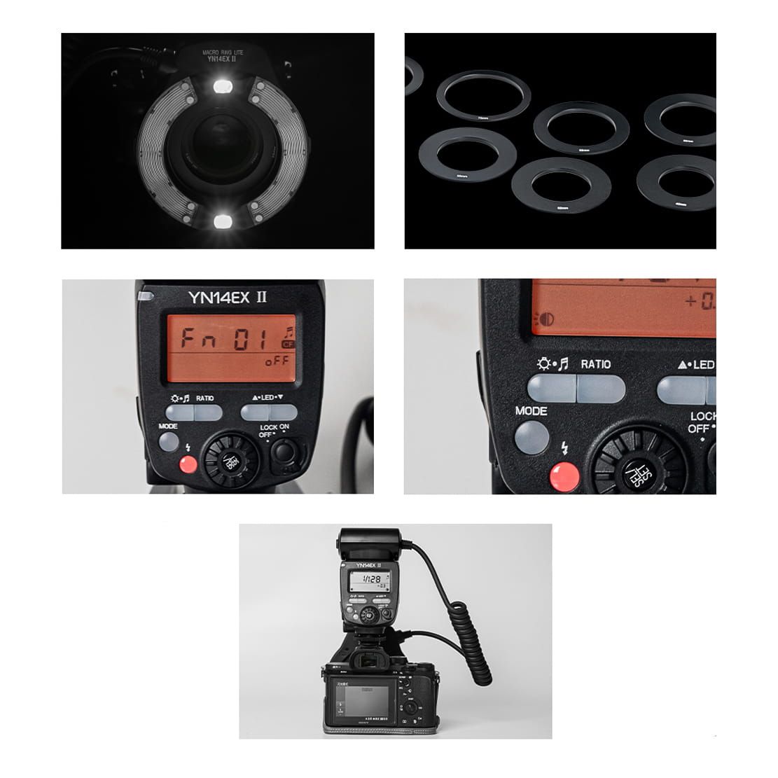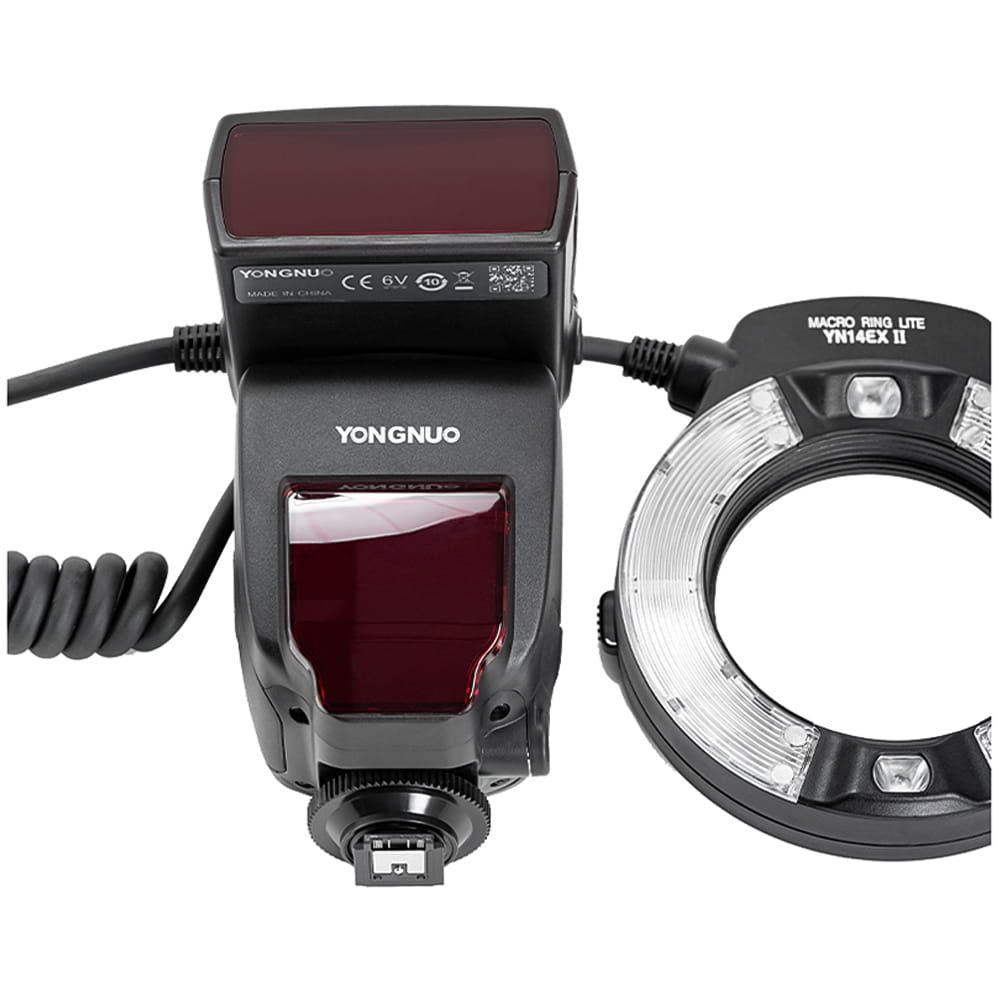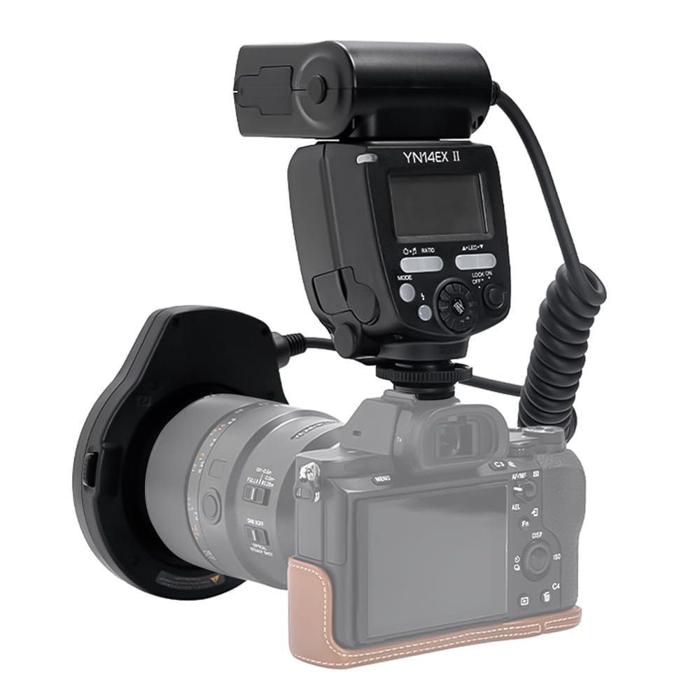 Кільцева лампа для макрофотографії yongnuo yn-14 ex ii. Присвячений апаратом Sony з міс - SLR та беззеркальними камерами. Він складається з одиниці, що контролює зовнішній вигляд, що нагадує традиційну репортерну лампу та передню частину об'єктива, встановлену на фронт, одним із спеціально профітованих адаптерів. У наборі барвистих накладок змінює кольорову температуру та світлий колір та корпус.
